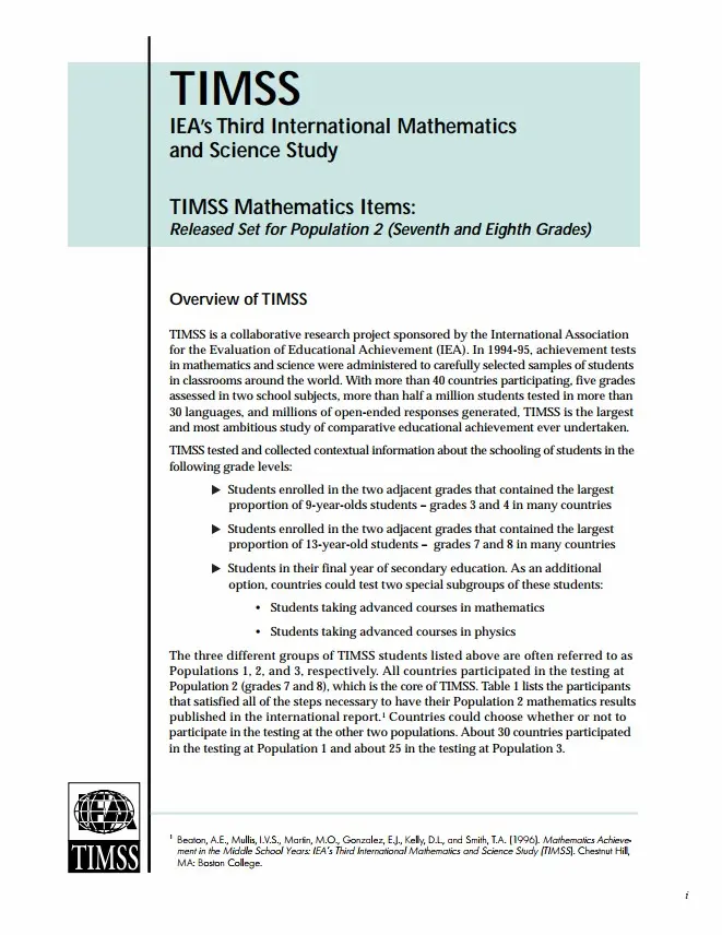 تیمز یکی از مطالعاتی است که توسط IEA انجام میشود تا به سیستمهای آموزشی جهان کمک کند تا بتوانند موفقیت آموزشی دانشآموزانشان را با سیستمهای آموزشی دیگر مقایسه کنند و از تجارب دیگر سیستمها برای طراحی سیاست آموزشی مؤثر استفاده کنند. این ارزیابی اولینبار در سال ۱۹۹۵ انجام گردید و پس از آن هر چهار سال یکبار انجام میگردد. از این رو اطلاعات نموداری مربوط به برخی از سیستمهای آموزشی از سال ۱۹۹۵ تا ۲۰۱۵ وجود دارد. تیمز دانشآموزان مقطع چهارم و هشتم (در قدیم مطابق با سوم راهنمایی بود) را مورد ارزیابی قرار میدهد.